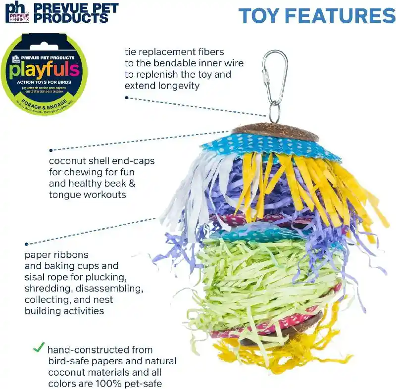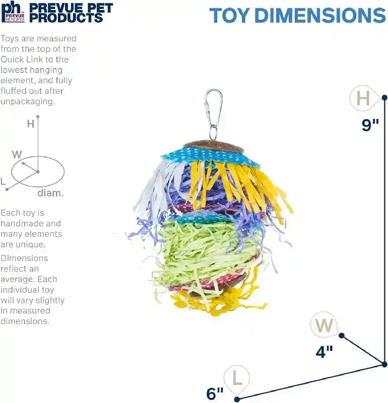 Prevue Pet Products Barn Dance 62675 is a colorful, dangling pull toy designed for satisfying preening instincts and discouraging plucking in your bird. Our Barn Dance toy is made from an assortment of Sisal Ropes and multicolored paper, providing your bird with mental stimulation and hours of fun. The coconut shell is perfect for beak and tongue exercise. All materials are 100% pet safe with non-toxic, food-grade colors and connect easily to cage with stainless steel quick-link attachments– actual measurements may vary slightly. As always, supervise birds at play. Our Bance Dance toy measures 5" diameter and 6 1/2" high. Ideal for x-small, small, and medium birds measuring 4" to 18" beak to tail.