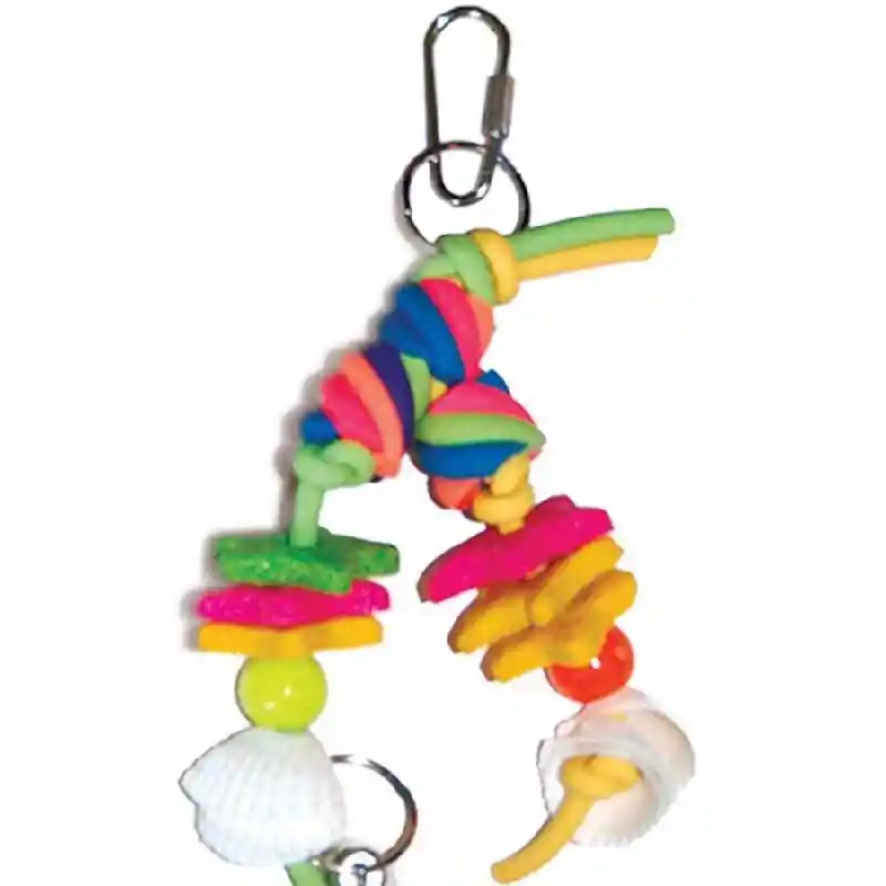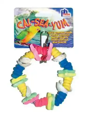 Cal-Sea-Yums Dollar 60505 combines sea shells and ground sea shell clusters to keep beaks and nails trimmed as your bird bites, chomps and plays. Easily connected to your cage with quick-link attachments and made from 100% pet safe materials with non-toxic, food grade colors, Cal-Sea-Yums may include latex ropes, rings, beads, natural sea shells and ground seashell wafers. Toy is hand made and actual measurements may vary slightly. As always, supervise birds at play. Our Cal-Sea-Yum Dollar bird toy is 7" Long and 5" Wide, ideal for Small and Medium birds.