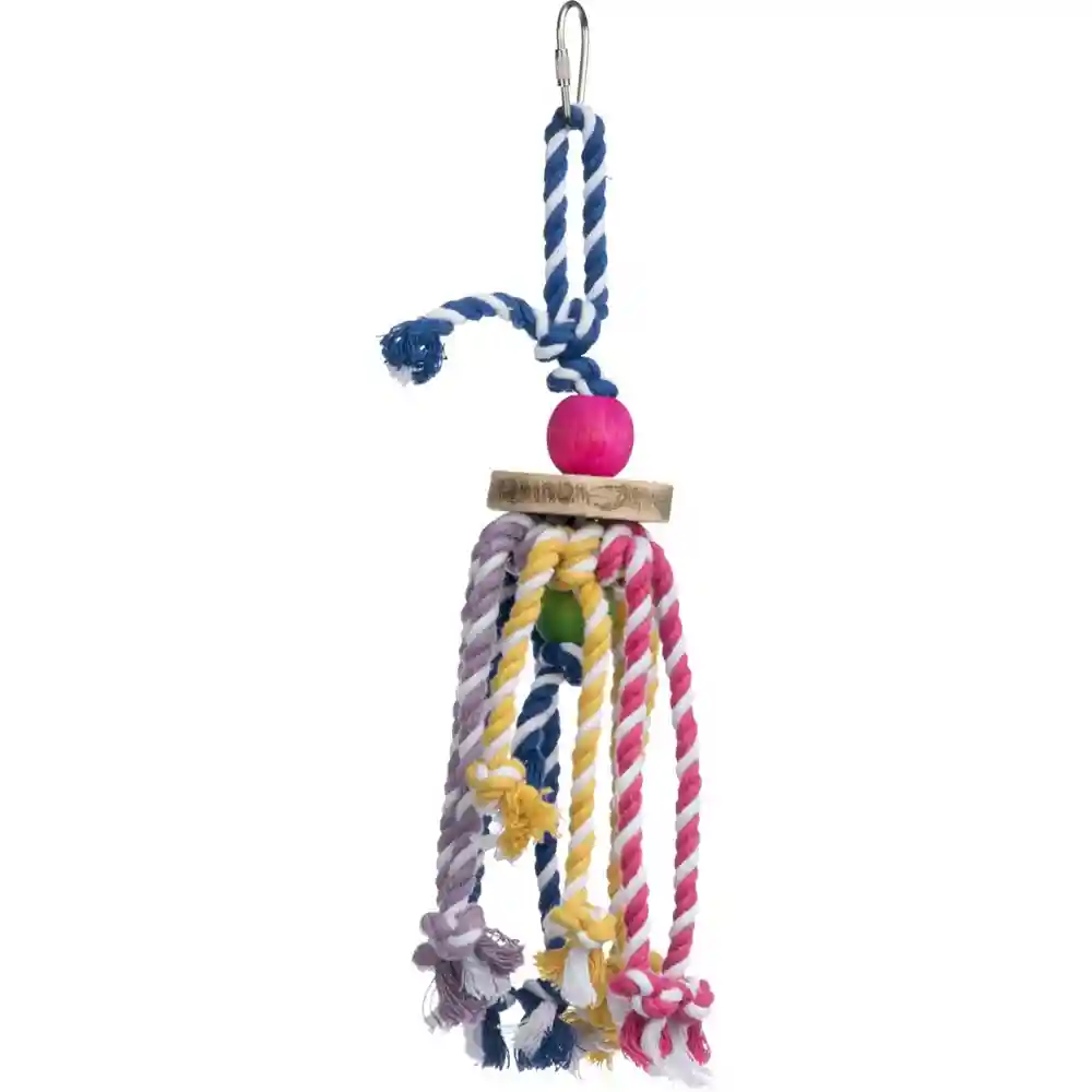 Prevue Pet Products Court Jester Toy 62546 is a colorful, dangling pull toy designed for satisfying preening instincts and discouraging plucking in your bird. Made from a soft cotton rope, Coffeawood and hardwood shapes for beak and tongue exercise. All materials are 100% pet safe with non-toxic, food-grade colors and connect easily to cage with stainless steel quick-link attachments– actual measurements may vary slightly. As always, supervise birds at play. Our Court Jester bird toy measures 2 1/4" in diameter and 12" High. Ideal for x-small and small birds measuring 4" to 13" beak to t