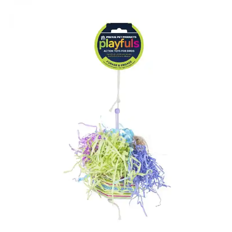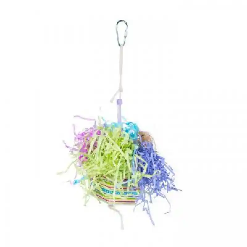 Prevue Pet Products Baskets Banquet 62673 is a multicolored pull toy designed for satisfying preening instincts, discouraging plucking in your bird, and satisfying nesting instincts. Basket of Bounty is made from an assortment of cotton twine, coconut fibers, and multi-colored paper providing your bird with mental stimulation and hours of fun. The plastic beads provide a rugged texture for beak and tongue exercise. The imaginative paper cup provides a place for your bird to satisfy their nest-building urges. All materials are 100% pet safe with non-toxic, food-grade colors and connect easily to cage with stainless steel quick-link attachments- actual measurements may vary slightly. As always, supervise birds at play. Our Baskets of Bounty toy measures 4" in diameter and 7" high.