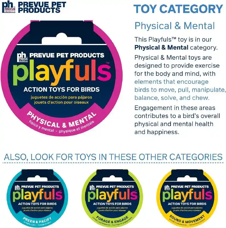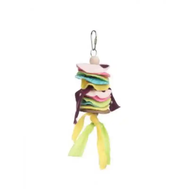 Prevue Pet Products Fairy Queen Bird Toy 62545 is a colorful, dangling pull toy - satisfying preening instincts and discouraging plucking in your bird. Made from a soft fleece and hardwood shapes for beak and tongue exercise. All materials are 100% pet safe with non-toxic, food-grade colors and connect easily to cage with stainless steel quick-link attachments and– actual measurements may vary slightly. As always, supervise birds at play. Our Fairy Queen bird toy measures 3" in diameter and 8 1/2" high. Ideal for x-small and small birds measuring 4" to 13" beak to tail.