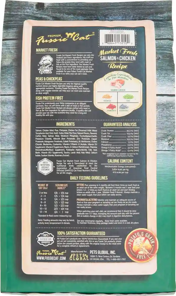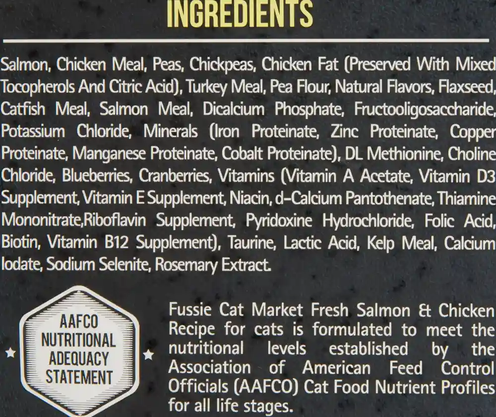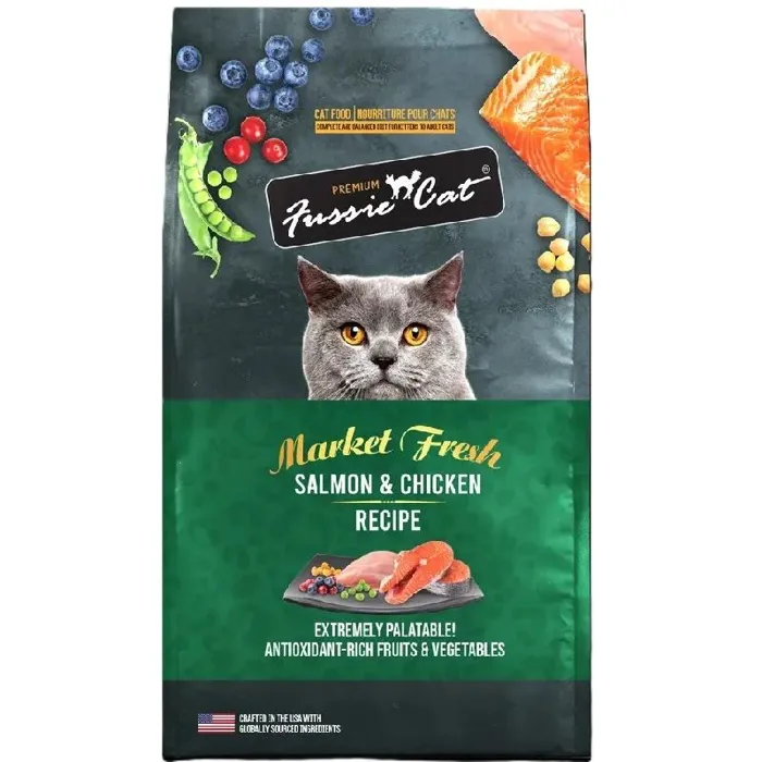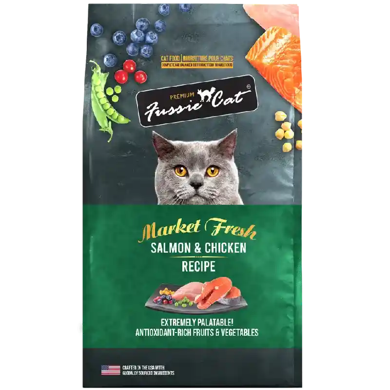 Fussie Cat Market Fresh Salmon & Chicken Recipe Dry Cat Food is created with the freshest and finest ingredients for your feline family member. Cats are notoriously fussy when it comes to their food and require a diet based on animal proteins to truly thrive. That's why Fussie Cat tailors the taste of each recipe based on actual feline feedback to ensure it's equally delicious. This Physiologically Tuned and grain-free recipe features real salmon and chicken as the first ingredients to provide complete, high-quality protein and an excellent source of vitamin B12, vitamin B6 and both Omega-3 and Omega-6 fatty acids.