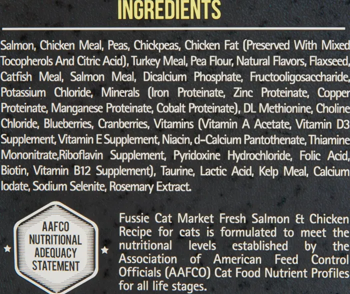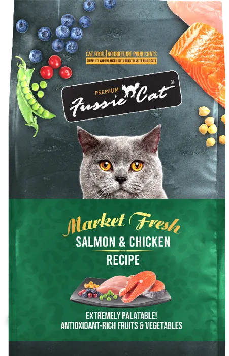 Fussie Cat Market Fresh Salmon & Chicken Recipe Dry Cat Food is created with the freshest and finest ingredients for your feline family member. Cats are notoriously fussy when it comes to their food and require a diet based on animal proteins to truly thrive. That’s why Fussie Cat tailors the taste of each recipe based on actual feline feedback to ensure it’s equally delicious. This Physiologically Tuned recipe features real salmon and chicken as the first ingredients to provide complete, high-quality protein and an excellent source of vitamin B12, vitamin B6 and both Omega-3 and Omega-6 fatty acids.