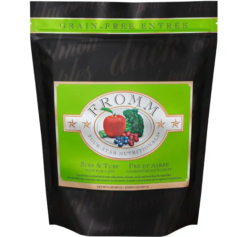 Fromm Four-Star Surf & Turf Recipe is an exquisite, grain-free blend of salmon, chicken, and whitefish. This recipe is specially prepared to ensure consistency, quality, and superior taste in each and every bowl. Surf & Turf Recipe cat food provides complete and balanced nutrition for cats of all ages and can be alternated with other Fromm Four-Star recipes.