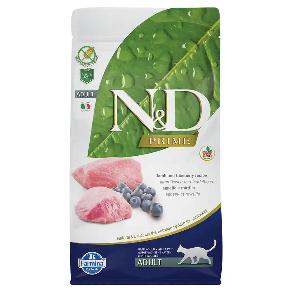 NUTRITION FOR CARNIVORES. N&D Prime Lamb & Blueberry Feline is a complete and balanced diet for all life stages with 98% of the protein from animal source formulated to meet the nutritional levels for maintenance. Made with Non-GMO and human-grade fresh (never frozen) ingredients like free-range grass-fed lamb, free-range eggs, sustainably sourced wild-caught herring, sweet potatoes and blueberry. Low glycemic index, high-protein, grain-free and gluten-free recipe with no legumes, soy, meals, by-products, hormones, antibiotics, or artificial preservatives. Made with natural antioxidants, prebiotics and integrated additional taurine. All formulations are scientifically-proven and clinically-tested thru certified cruelty-free research. Guaranteed over 90% digestibility. THE ONLY KIBBLE FILLED WITH COLD INJECTED LIFE ESSENTIALS (dehydrated fruits and vegetables, botanicals, vitamins, and minerals are vacuum-infused cold-pressed into the kibble after cooking). Nitrogen filled bags to prevent the food from oxidation. All packaging is recyclable and BPA-Free.
