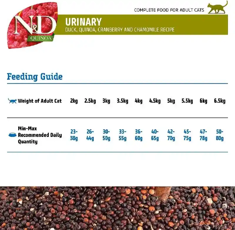 N&D Quinoa URINARY - Duck, quinoa, cranberry and chamomile recipe for adult cats is formulated to meet the nutritional levels established by the AAFCO Cat Food Nutrient Profiles for maintenance.