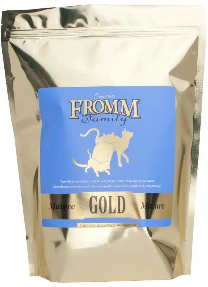 Fromm Gold Mature Dry Cat Food is perfect for your less active adult, your senior, or your cat that needs some weight management help. Made with high quality protein like chicken paired with fresh produce including potatoes and whole eggs, Fromm Gold Mature Dry Cat Food provides well rounded, balanced nutrition for your furry friend without the unnecessary fillers! This recipe also supports the health of your cat's coat and skin with guaranteed levels of Omega fatty acids and is enhanced with probiotics to ensure that their digestion is right on track! Fromm Gold Mature Dry Cat Food is made with quality ingredients found in the United States with no artificial colors, flavors, or preservatives that any cat is sure to love!