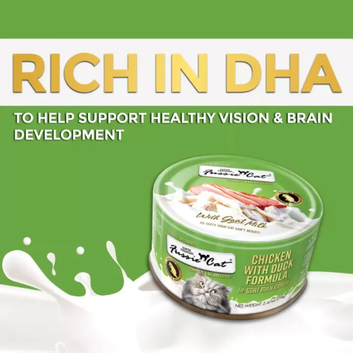 Discover gourmet dining with our Chicken With Duck formula, blending tender chicken with the refined taste of duck in a creamy goat milk gravy. This recipe is a true testament to Fussie Cat’s culinary craft, offering a succulent blend that will satisfy the palate of the most discerning feline gourmets. Our carefully crafted formula ensures that your cat enjoys a balanced meal, rich in essential nutrients and designed to promote overall health. With added DHA for cognitive and visual support, this grain-free dish is perfect for cats at any stage of life. Indulge your cat with the luxurious tast