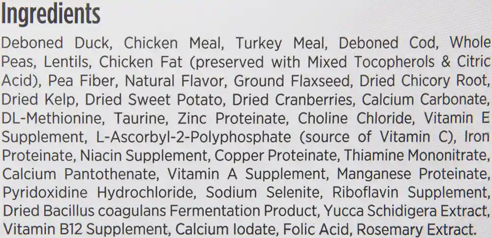 - Deboned duck, chicken meal, turkey meal and deboned cod listed as the top 4 ingredients, this product is forged with 82% animal-based proteins.