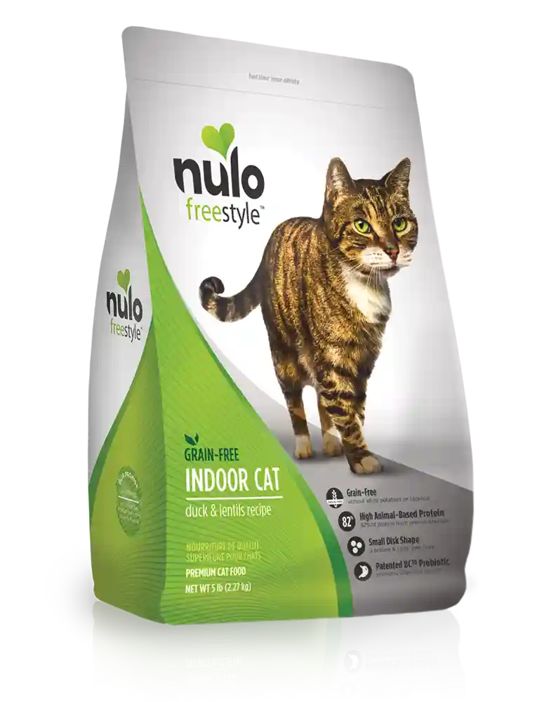 Provide your feline friend with the nutrition she needs and deserves with Nulo Freestyle Duck and Lentils Grain-Free Indoor Dry Cat Food! Our cat companions require rich protein to stay fit and healthy which is why this kitty kibble is purr-fect with 82% of proteins coming from real meat including duck, chicken and turkey! Plus, your cat will be sure to get the amino acids she need to build strong muscles and bounce back from a day of play. This grain-free recipe is specially formulated with low-glycemic index ingredients and advanced probiotics to ensure that indoor cats get the best nutrition!