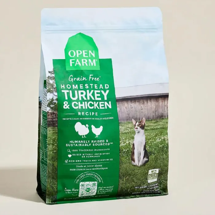Open Farm Homestead Turkey and Chicken Recipe is a Grain-free recipe with certified humane turkey and chicken, delivered fresh from our partner family farms, with ocean-caught seasonal fish and nutritious coconut oils. Omega 3 and Omega 6 fatty acids, cranberries, and dendelion greens support urinary and digestive health. With non-GMO frutis and vegetables, and zero grains, Open Farm Homestead Turkey and Chicken is ideal for cats with sensitive digestion or certain grain allergies. With certified humane, antibiotic-free deboned turkey and chicken as the first ingredients, Open Farm is changing the way pet food is made.