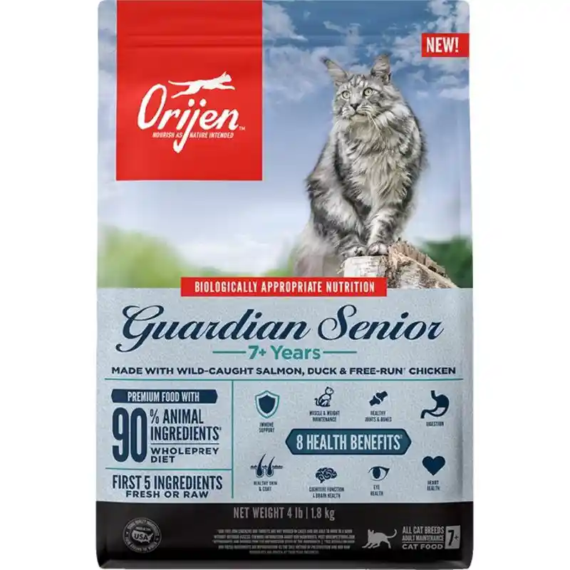 Help guard your senior cat’s vitality with ORIJEN Guardian Senior diet, specially formulated to support your cat’s unique needs as they grow older. Ideal for cats 7+, this diet is packed with nourishing fresh or raw animal ingredients including wild-caught salmon, duck and free-run chicken to provide your mature cat with the protein they need to thrive. And with succulent and nutrient-rich WholePrey ingredients like organs and bone, it helps target 8 key health benefits that help keep your mature cat supported and vital as they grow older with you.