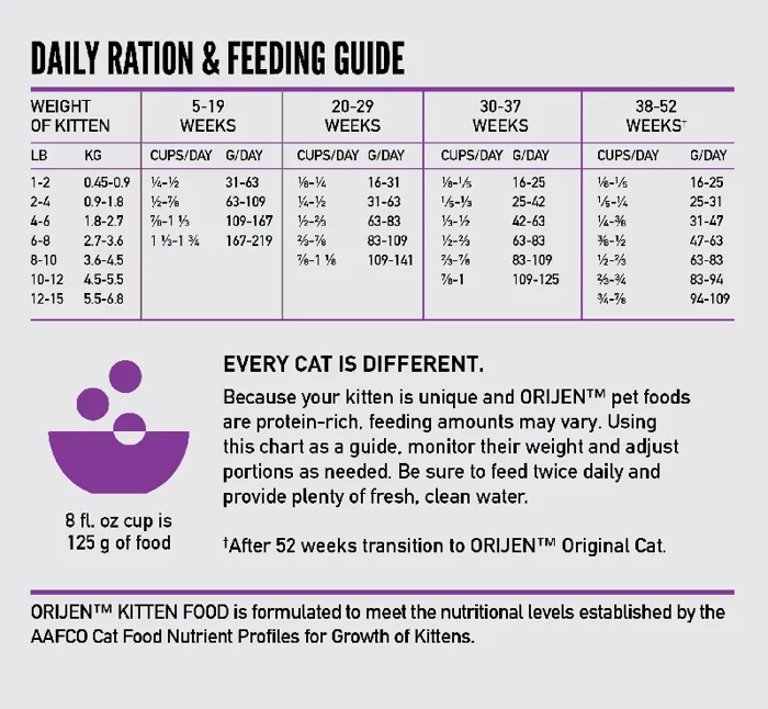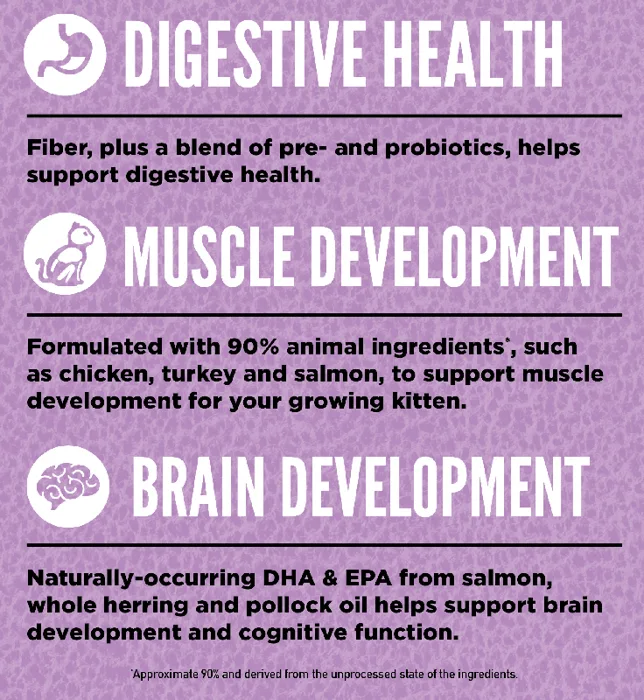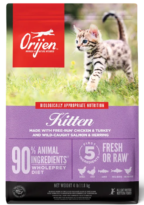 ORIJEN Kitten diet is specially formulated to give your kitten the nutrients they need to grow healthy and strong. Packed with 90%* premium animal ingredients like chicken, turkey and salmon, it helps support muscle development in your growing kitten. It also contains 15 fresh or raw ingredients, including WholePrey ingredients like muscle meat, organs and bone, the most succulent and nourishing parts of the prey. This diet helps support your kitten’s brain development and cognitive function with naturally occurring DHA and EPA from salmon, whole mackerel and herring, and pollock oil. Your kitten will thrive when you feed them the fresh and raw animal protein they need.