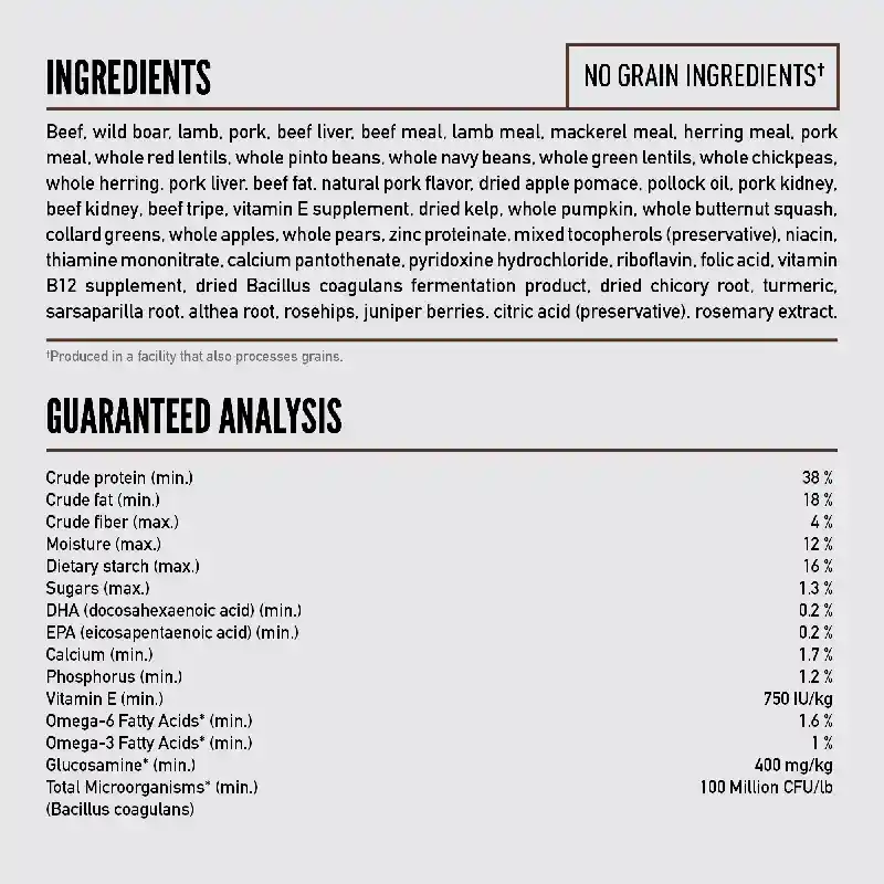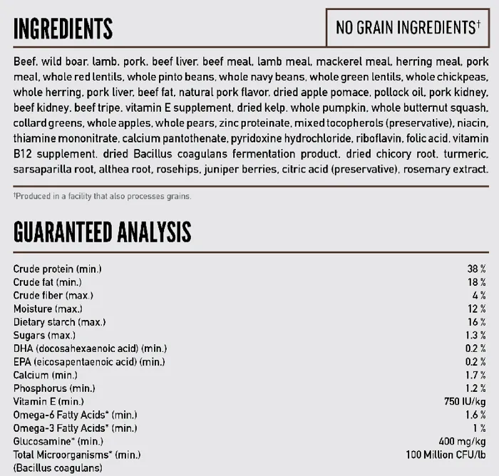 - Offers a rich diversity of fresh and raw meats; 85% meat inclusions, 15% veggies & fruits, and 0% grain, tapioca, or plant protein concentrates