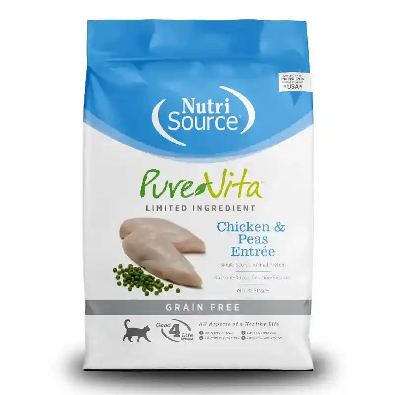 As a member of our grain free series of cat foods, NutriSource Pure Vita Grain Free Chicken & Peas Entrée Cat Food is formulated to meet AAFCO guidelines for all life stages. See the size of this kibble.