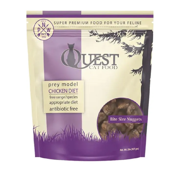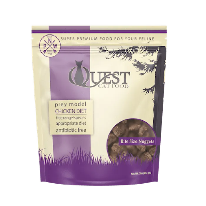Steve’s Real Food freeze-dried raw cat food in chicken is made with free-range poultry. Chicken is a great source of high-quality protein, and our freeze-dried raw cat food is a rich source of amino acids such as taurine, which is critical for maintaining healthy eyesight, heart function, and a strong immune system in cats. Quest Cat Food is a Prey model recipe consisting of 95% chicken meat, bone, and organ, and 5% superfoods such as New Zealand Green Lipped Mussel and raw goat milk.