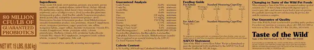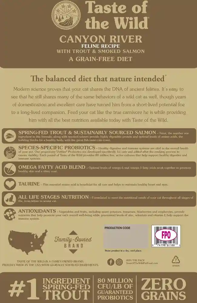 Nourish your favorite feline with the balanced diet nature intended with Taste of the Wild Canyon River Grain-Free Dry Cat Food! Formulated with novel proteins including trout and smoked salmon, this grain-free recipe includes peas and sweet potatoes that deliver the highly-digestible energy your active cat needs, along with natural antioxidant support from real fruits and vegetables and dried chicory root for prebiotic support and healthy digestion. Essential minerals are chelated with amino acids to optimize their absorption and ensure maximum benefit, for complete and balanced nutrition with a taste of the wild your furry friend constantly craves!