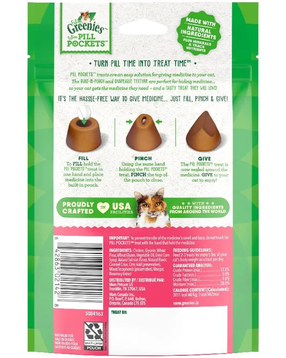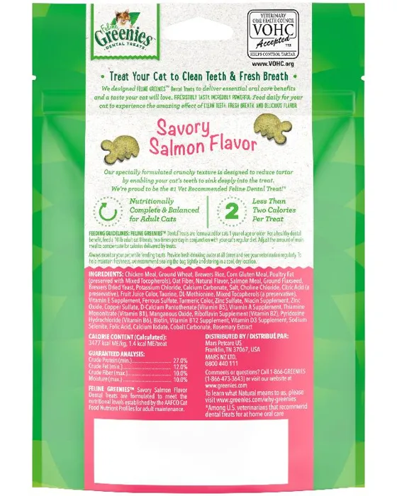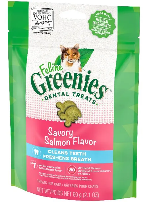 FELINE GREENIES Savory Salmon Flavor Dental Cat Treats were designed to help keep your cat’s teeth clean and healthy. The crunchy texture of these irresistible cat snacks helps clean teeth, reduce tartar buildup, and freshen cat breath, letting you enjoy cuddle time even more. Made with natural ingredients plus vitamins, minerals, and other nutrients, these tasty natural dental treats are nutritionally complete and balanced for adult cats. Plus, FELINE GREENIES Dental Treats contain less than 2 calories per treat and are the #1 vet recommended feline dental treat.* For some healthy play, try placing a few cat treats inside a treat dispenser toy and watch your cat chase and swat away. Give your cat FELINE GREENIES Dental Treats, and you're sure to hear happy purrs of joy. FELINE GREENIES Daily Dental Treats... for healthy and happy dental care.