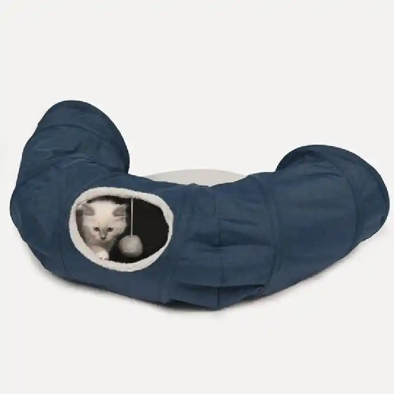 It includes a sleeping cushion and peek-a-boo opening with plush rim and pompom toy. The tunnel is washable, fully collapsible and easy to store. We offer two modern colors (blue and grey) which will fit any home interior - just like other Vesper products. Great for playful kittens and cats.