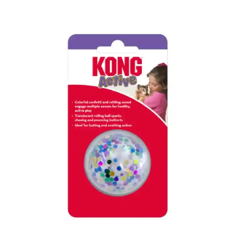 KONG Cat Active Confetti Ball is a party in a ball! This rolling, rattling confetti-filled ball is fun for one or more cats who love to play, as well as cats who need a little extra spark in their daily routine. This ball engages multiple senses and stimulates chasing, swatting, batting, and pouncing action for full-body exercise and play. Colorful confetti and rattling sound engage multiple senses for healthy, active play Translucent rolling ball sparks chasing and pouncing instincts Ideal for batting and swatting action