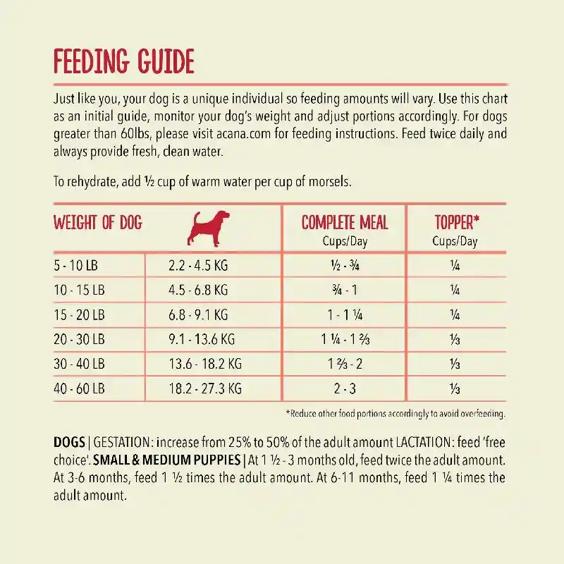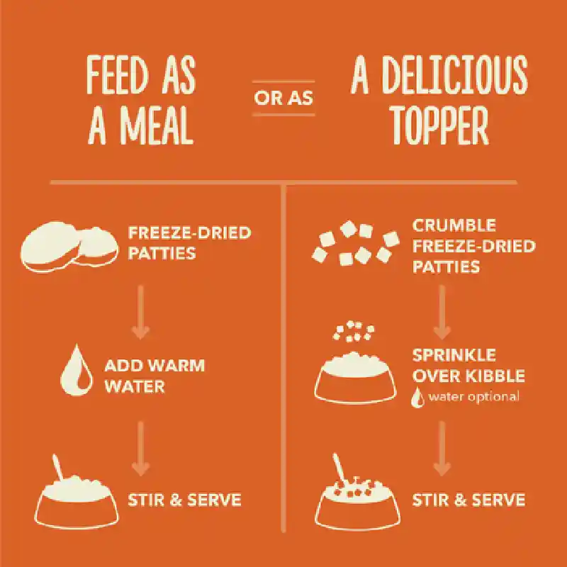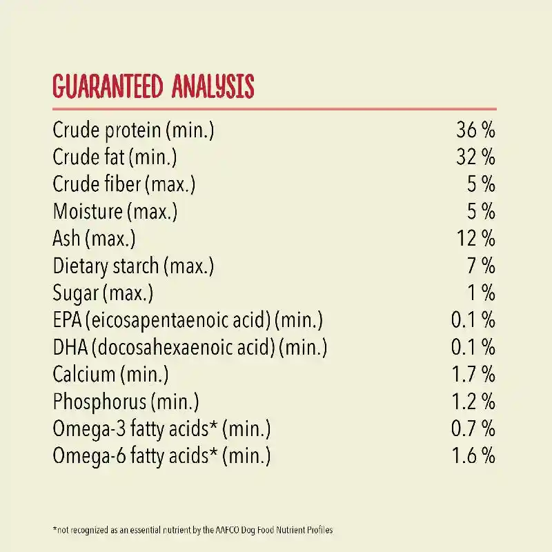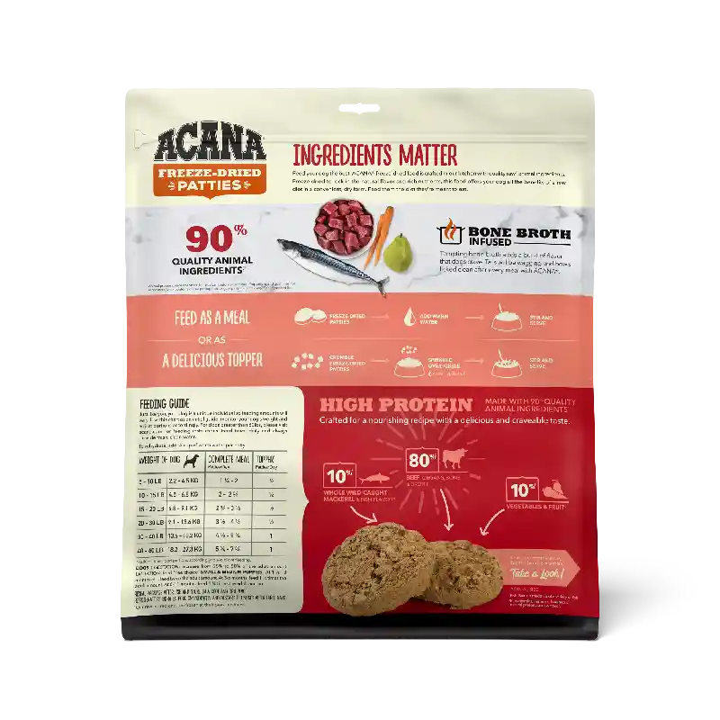 ACANA® Freeze-Dried Food gives your dog all the benefits of raw nutrition, with none of the mess! Available in bite sized morsels or breakable patties, our Beef Recipe satisfies your dog’s natural cravings in a convenient, freeze-dried form. It’s made from 90% quality animal ingredients* including beef, organs, and bone, and balanced with wholesome vegetables and fruit. It’s also infused with hearty and delicious bone broth for a taste dogs love. Satisfy your dog’s cravings with the nutritious animal ingredients in ACANA Freeze-Dried Food!