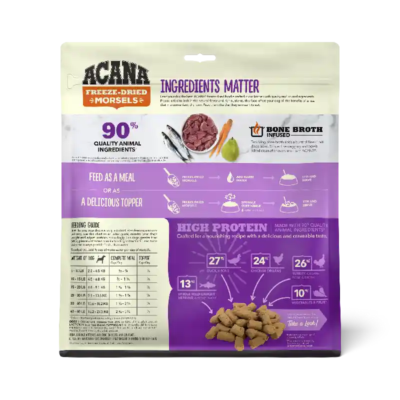 ACANA® Freeze-Dried Food gives your dog all the benefits of raw nutrition, with none of the mess! Available in bite sized morsels or breakable patties, our Duck Recipe satisfies your dog’s natural cravings in a convenient, freeze-dried form. It’s made from 90% quality animal ingredients* including duck, chicken and turkey organs and bone, and balanced with wholesome vegetables and fruit. It’s also infused with hearty and delicious bone broth for a taste dogs love. Satisfy your dog’s cravings with the nutritious animal ingredients in ACANA Freeze-Dried Food! *Approximate and derived from the unprocessed state of the ingredients