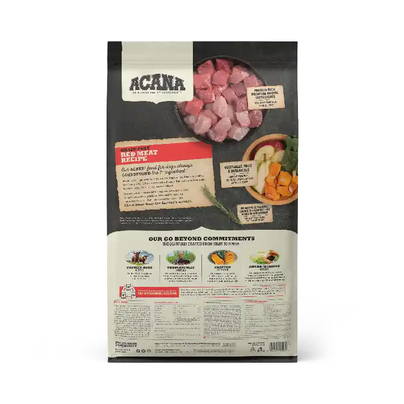 Our ACANA® foods always goes beyond the 1st ingredient, thoughtfully crafting our recipes from start to finish. ACANA Red Meat recipe is balanced with 60%* quality animal ingredients like ranch-raised beef and Yorkshire pork, and 40%+ fruits, vegetables, and botanicals. Artificial colors, flavors or preservatives are never added in our kitchen. Our premium ingredients come from a curated group of farmers, ranchers and fishers we’ve known and trusted for decades, and we approach every batch with an unsurpassed commitment to safety and quality in our award-winning Kentucky kitchen. The result is a protein-rich, nutritious, and delicious dog food to help them live a healthy, happy life. *approximate and derived from the unprocessed state of the ingredients. +we also add vitamins, minerals, natural preservatives and probiotics.