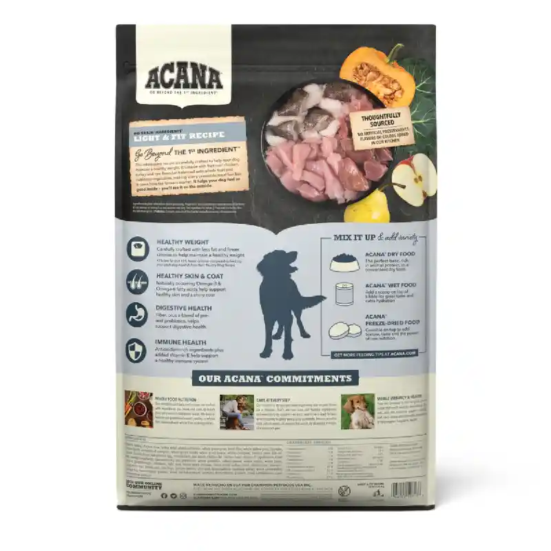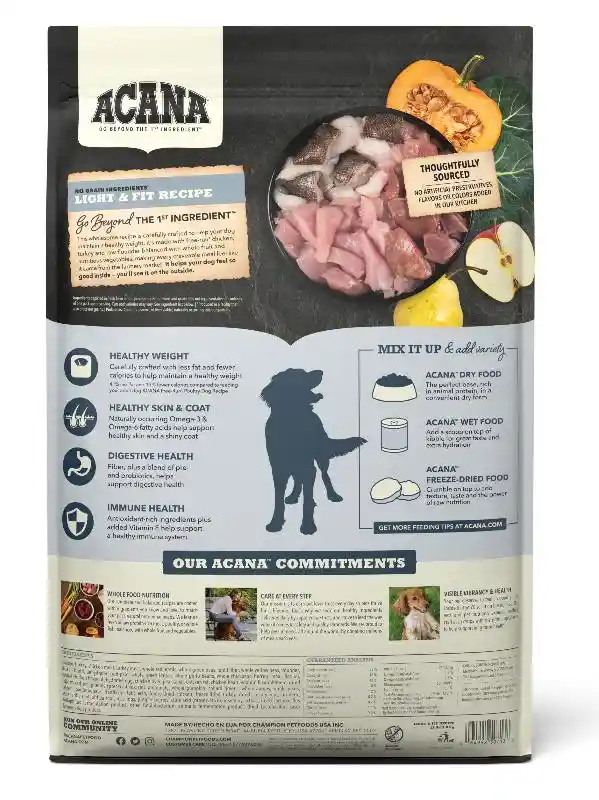 Our ACANA® foods always goes beyond the 1st ingredient, thoughtfully crafting our recipes from start to finish. Your dog needs a high-protein food to help support a healthy body weight and peak conditioning. ACANA Light & Fit is balanced with 60%* quality animal ingredients like free-run chicken and turkey, cage-free eggs, and 40%+ fruits, vegetables, and botanicals like whole pumpkin. Artificial colors, flavors or preservatives are never added in our kitchen. Our premium ingredients come from a curated group of farmers, ranchers and fishers we’ve known and trusted for decades, and we approach every batch with an unsurpassed commitment to safety and quality in our award-winning Kentucky kitchen. The result is a protein-rich, nutritious, and delicious dog food to help them live a healthy, happy life. *approximate and derived from the unprocessed state of the ingredients. +we also add vitamins, minerals, natural preservatives and probiotics.