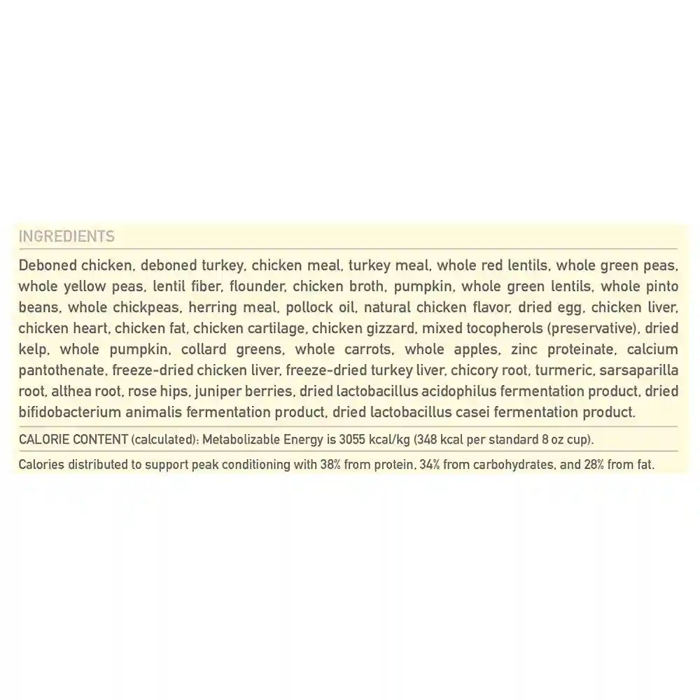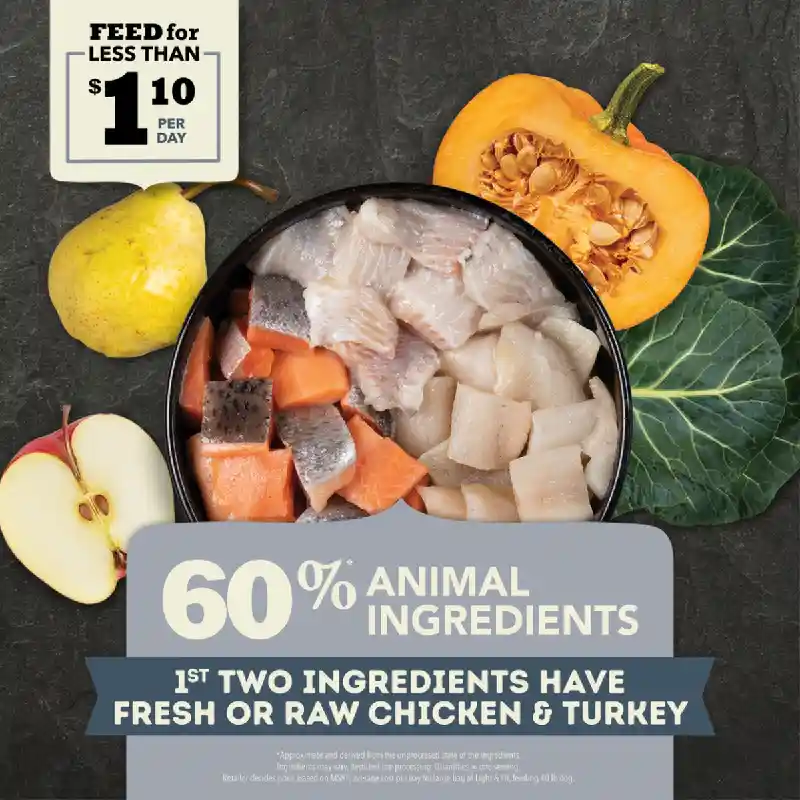 Our ACANA® foods always goes beyond the 1st ingredient, thoughtfully crafting our recipes from start to finish. Your dog needs a high-protein food to help support a healthy body weight and peak conditioning. ACANA Light & Fit is balanced with 60%* quality animal ingredients like free-run chicken and turkey, cage-free eggs, and 40%+ fruits, vegetables, and botanicals like whole pumpkin. Artificial colors, flavors or preservatives are never added in our kitchen. Our premium ingredients come from a curated group of farmers, ranchers and fishers we’ve known and trusted for decades, and we approach every batch with an unsurpassed commitment to safety and quality in our award-winning Kentucky kitchen. The result is a protein-rich, nutritious, and delicious dog food to help them live a healthy, happy life. *approximate and derived from the unprocessed state of the ingredients. +we also add vitamins, minerals, natural preservatives and probiotics.