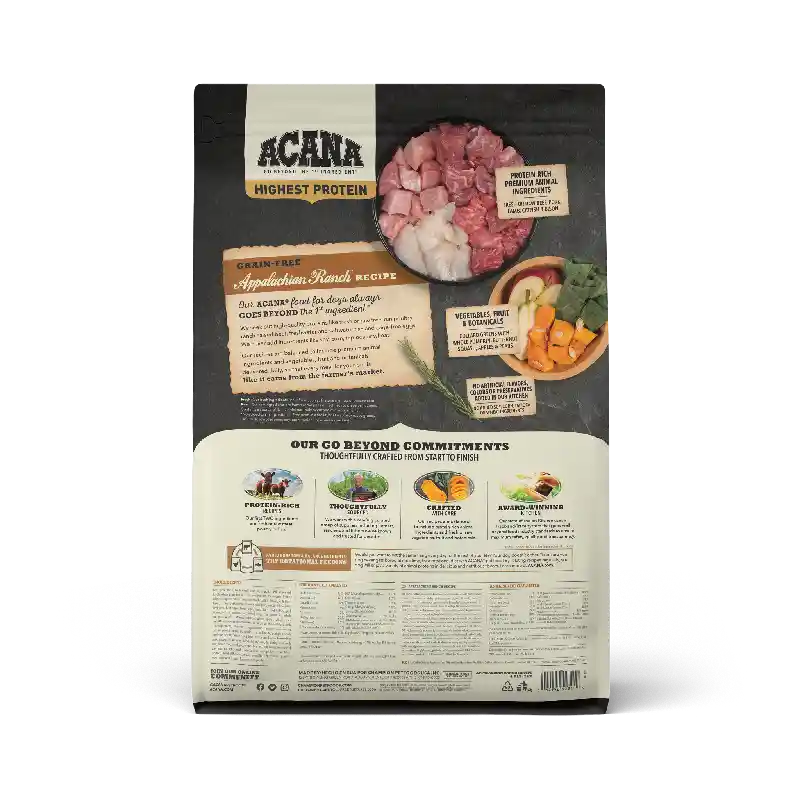Our ACANA® foods always goes beyond the 1st ingredient, thoughtfully crafting our recipes from start to finish. With a recipe blend inspired by Kentucky’s fertile lands, ACANA® Appalachian Ranch is crafted with 70%* quality animal ingredients like ranch-raised beef, Yorkshire pork, grass-fed lamb, catfish and bison, and 30%+ fruits, vegetables, and botanicals, many delivered daily. Artificial colors, flavors or preservatives are never added in our kitchen. Our premium ingredients come from a curated group of farmers, ranchers and fishers we’ve known and trusted for decades, and we approach every batch with an unsurpassed commitment to safety and quality in our award-winning Kentucky kitchen. The result is a protein-rich, nutritious, and delicious dog food to help them live a healthy, happy life. *approximate and derived from the unprocessed state of the ingredients. +we also add vitamins, minerals, natural preservatives and probiotics.