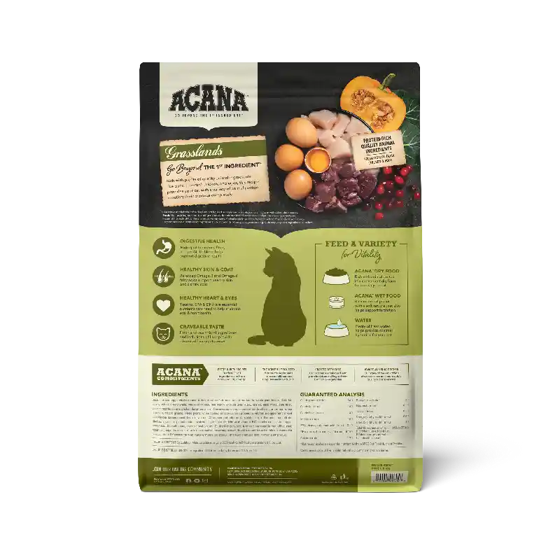 Our ACANAยฎ foods always goes beyond the 1st ingredient, thoughtfully crafting our recipes from start to finish. Inspired by Kentuckyโs lush grasslands, our grain-free ACANAยฎ Grasslands is crafted with 75%* quality animal ingredients like fresh or raw** duck, chicken, cage-free eggs, freshwater fish, and quail, and 35%+ fruits, vegetables, and probiotics with no added soy, corn, wheat or tapioca. Artificial colors, flavors or preservatives are never added in our kitchen. Our premium ingredients come from a curated group of farmers, ranchers and fishermen weโve known and trusted for decades, and we approach every batch with an unsurpassed commitment to safety and quality in our award-winning Kentucky kitchen. The result is a protein-rich, nutritious, and delicious cat food to help them live a healthy, happy life. *approximate and derived from the unprocessed state of the ingredients. +we also add vitamins, minerals, natural preservatives and probiotics **Our fresh ingredients use refrigeration as the sole method of preservation. Our raw ingredients are the same as our fresh, but are frozen at the peak of freshness to preserve nutrients