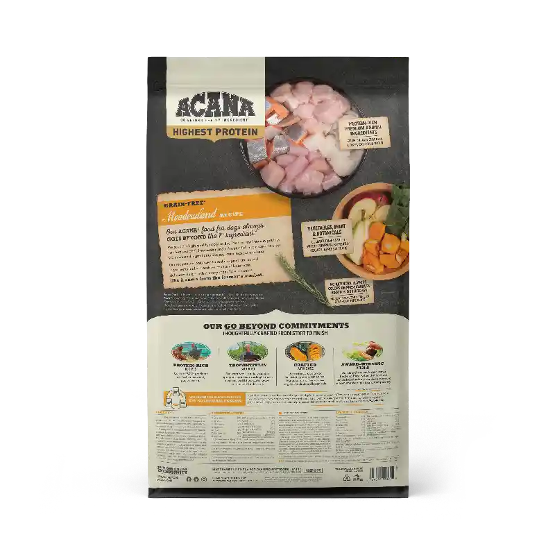 Our ACANA® foods always goes beyond the 1st ingredient, thoughtfully crafting our recipes from start to finish. With a recipe blend inspired by Kentucky’s fertile lands, ACANA Meadowland is crafted with 70%* quality animal ingredients like free-run chicken and turkey, wild-caught and sustainably farmed fish, and 30%+ fruits, vegetables, and botanicals, many delivered daily. Artificial colors, flavors or preservatives are never added in our kitchen. Our premium ingredients come from a curated group of farmers, ranchers and fishers we’ve known and trusted for decades, and we approach every batch with an unsurpassed commitment to safety and quality in our award-winning Kentucky kitchen. The result is a protein-rich, nutritious, and delicious dog food to help them live a healthy, happy life. *approximate and derived from the unprocessed state of the ingredients. +we also add vitamins, minerals, natural preservatives and probiotics