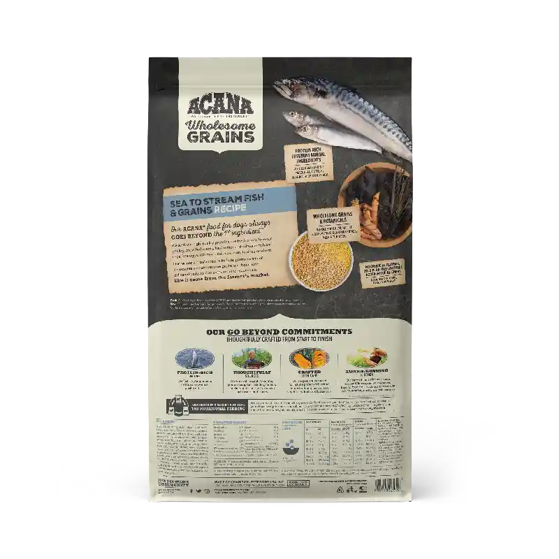 ACANA always goes above and beyond when it comes to crafting nutritious recipes. ACANA Wholesome Grains Sea to Stream Fish & Grains recipe is packed with delicious raw herring, mackerel, catfish and redfish, and complemented with wholesome grains like oats, sorghum, and millet. These grains are high in fiber and gluten-free, offering added nutrition that helps support a healthy digestive environment.