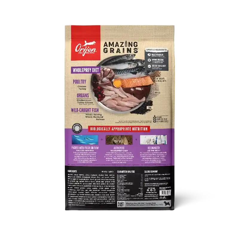 ORIJEN Amazing Grains is packed with fresh or raw animal protein and enhanced with hand-selected grains to give your dog peak nourishment. With 90%* premium animal ingredients, ORIJEN Puppy Large diet with Amazing Grains includes WholePrey ingredients from free-run chicken and turkey and wild-caught fish, including wild-caught salmon. These nutrient-dense poultry and fish ingredients nourish your large breed puppy’s rapid growth and development. This diet includes only the most amazing grains in a high-quality blend of oats, quinoa and chia and more, hand-selected to provide a balanced fiber ratio that helps support your large breed puppy’s digestive health.