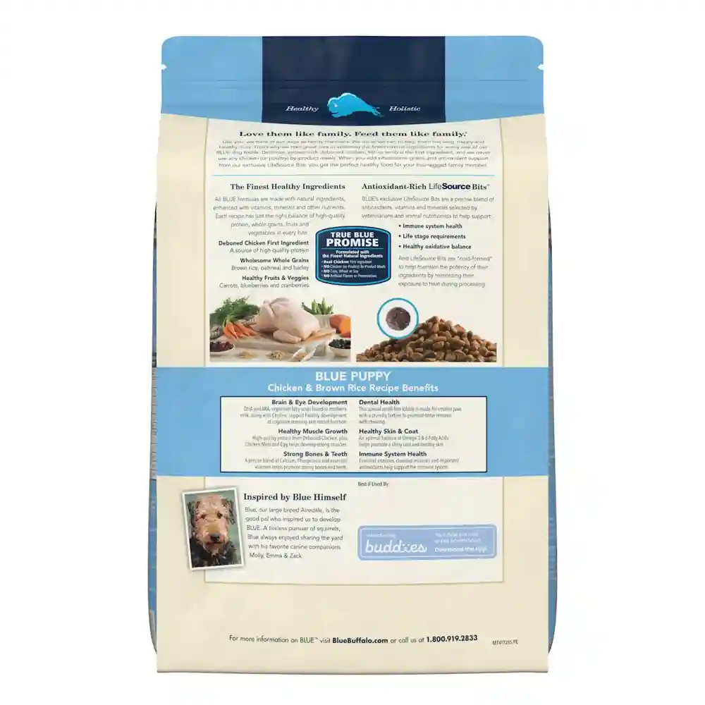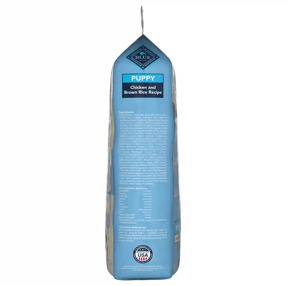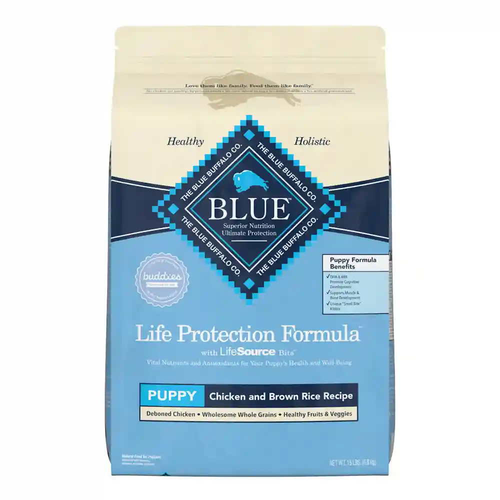 Because puppyhood is such an important stage in any dog’s life, BLUE Life Protection Formula Chicken and Brown Rice Puppy dry dog food is specially made to support the healthy growth and development of your puppy. It’s a high-quality, balanced recipe you can both feel great about. With real chicken first in a lineup of natural ingredients enhanced with vitamins, minerals, and other nutrients, this recipe is as delicious as it is healthy for your new best friend. Formulated specifically for puppies, this diet contains DHA and ARA — fatty acids found in mother’s milk — plus Choline, to support brain and eye development. Like all BLUE dry foods, BLUE Life Protection Formula includes exclusive antioxidant-rich LifeSource Bits, which are “cold-formed” to retain their potency.Give your puppy the balanced nutrition of BLUE Life Protection Formula today.BLUE Life Protection Formula is brought to you by Blue Buffalo, the leader in natural pet food. Blue Buffalo makes premium-quality pet foods featuring real meat, fruit, and vegetables. Love them like family. Feed them like family.