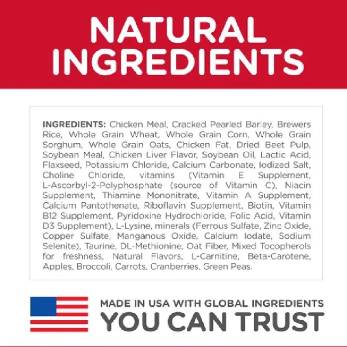 Original Formula: Chicken Meal, Brown Rice, Whole Grain Wheat, Whole Grain Corn, Whole Grain Sorghum, Cracked Pearled Barley, Whole Grain Oats, Pork Fat, Dried Beet Pulp, Corn Gluten Meal, Chicken Liver Flavor, Soybean Oil, Lactic Acid, Pork Flavor, Flaxseed, Potassium Chloride, Iodized Salt, Choline Chloride, vitamins (Vitamin E Supplement, L-Ascorbyl-2-Polyphosphate (source of Vitamin C), Niacin Supplement, Thiamine Mononitrate, Vitamin A Supplement, Calcium Pantothenate, Vitamin B12 Supplement, Pyridoxine Hydrochloride, Riboflavin Supplement, Biotin, Folic Acid, Vitamin D3 Supplement), L-Lysine, minerals (Ferrous Sulfate, Zinc Oxide, Copper Sulfate, Manganous Oxide, Calcium Iodate, Sodium Selenite), Taurine, Oat Fiber, L-Carnitine, Mixed Tocopherols for freshness, Natural Flavors, Beta-Carotene, Apples, Broccoli, Carrots, Cranberries, Green Peas.