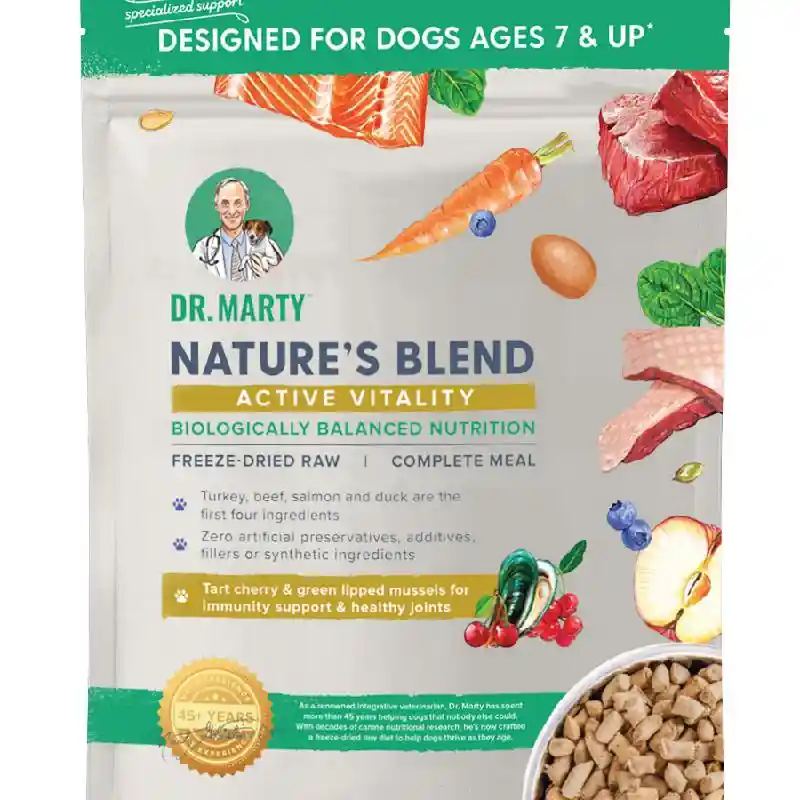 Active Vitality is a premium, freeze-dried raw food for dogs ages 7 years and up. Each batch is filled with high- quality meats and antioxidant- rich veggies and fruit for immunity support, joint mobility, healthy brain function, and balanced energy.