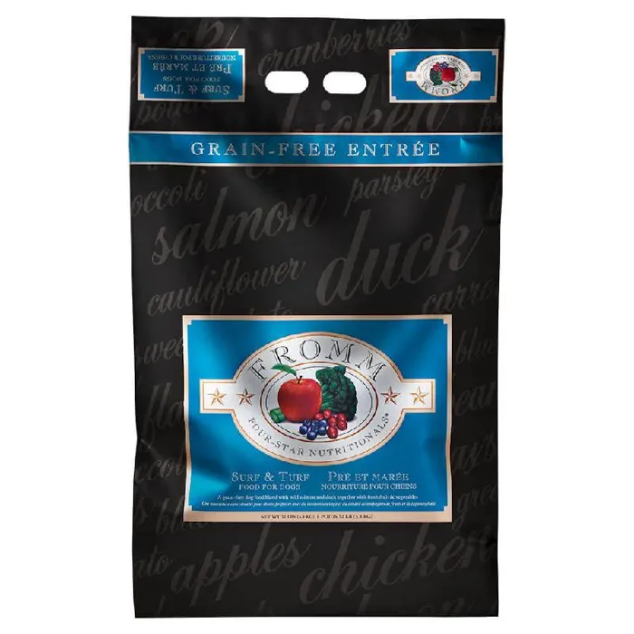 Fromm Four-Star Surf & Turf Recipe Food for Dogs is a savory grain-free blend of salmon, fish broth, chicken, potatoes, and an assortment of fruits and vegetables.