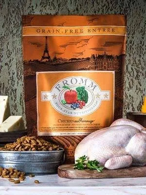 Fromm Four-Star Chicken Au Frommage(TM) Food for Dogs is a savory, grain-free recipe of chicken combined with lentils, potatoes, cheese, and fresh fruit and vegetables. This artisan blend is prepared in small batches, ensuring consistency, quality, and superior taste in each and every bowl. Chicken Au Frommage(TM) provides complete and balanced nutrition for dogs of all ages and can be fed in rotation with other Fromm Four-Star varieties.