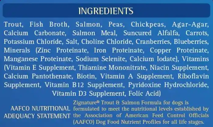 Fill your best friend's bowl with wholesome nutrition when you feed them Zignature Trout & Salmon Limited Ingredient Formula Grain-Free Canned Dog Food. Your pup will enjoy a delicious dinner made with real Trout and Salmon from the Northwestern US, wholesome peas, chickpeas, and cranberries. This meat-first recipe offers pups the protein they need to thrive, while Zignature's limited ingredient recipe throws out troublesome ingredients like chicken, corn, wheat, soy, and potatoes, creating peak hypoallergenic, low-glycemic nutrition. Combine that with key antioxidants, essential fatty acids, and a complete spectrum of vitamins and minerals for a well-rounded meal that goes beyond nature to become your pet's signature food for life.