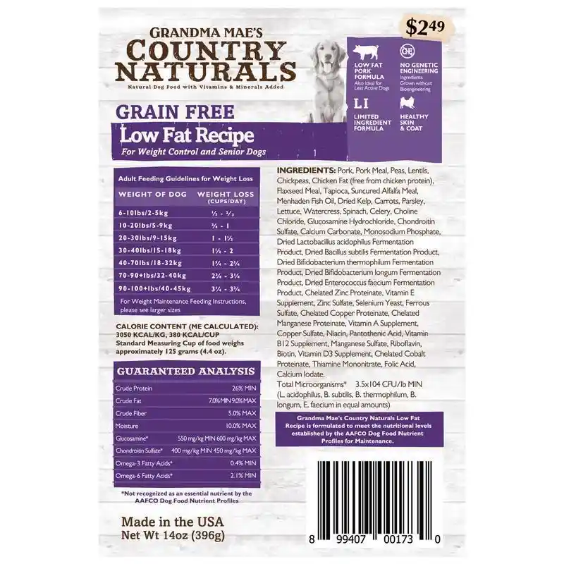 Our Grain Free Low-Fat Recipe is a non-GMO, limited ingredient dry food formulated specifically for weight control, seniors, and less active dogs. Made with high-quality, protein rich pork meal as the first ingredient, which is an excellent and extremely palatable protein choice for your dog, this low fat, grain free and chicken free formula is also a great choice for dogs with allergies. The protein in Grain Free Low-Fat Recipe is over 70% from animal sources and we use a slow-cook low-temperature process which helps retain the maximum nutritional value from all our ingredients.