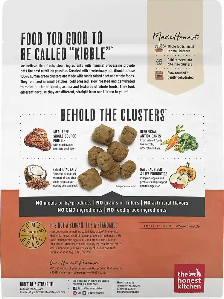 Dogs are family too, which is why they deserve the highest quality nutrition. The Honest Kitchen Grain-Free Beef Clusters Dry Dog Food is too good to be called kibble because it truly stands out from the rest with fresh, clean ingredients and minimal processing. The whole food clusters purposely don’t look like your traditional dry dog food and that’s because they’re made in small batches, cold-pressed and then slow-roasted and dehydrated. This process locks in the aroma, nutrients, textures of whole foods like beef, peas, lentils, eggs, carrots and more! So, give your canine companion nutritious and delicious clusters without compromise!