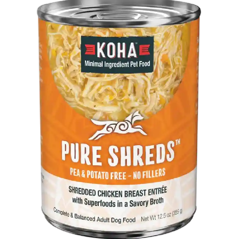 KOHA Pure Shreds are delicious shredded chicken breast recipes in a savory broth. Dogs go crazy for the shredded texture and the tasty superfood blend of pumpkin, carrots, & spinach. This low fat entrée is an excellent choice for weight control. Our Pure Shreds Shredded Chicken Breast Entrée does not contain any unnecessary fillers or artificial preservatives or carb-loaded fillers like peas, potatoes, and grains that can lead to digestive issues.