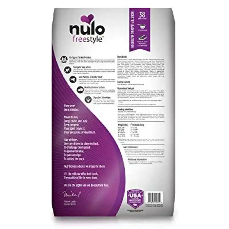 Designed for little dogs, Nulo FreeStyle Grain-Free Small Breed Salmon and Red Lentils recipe contains deboned salmon, turkey meal, menhaden fish meal, salmon meal, red lentils, sweet potatoes, chickpeas, miscanthus grass, ground flaxseed, dr