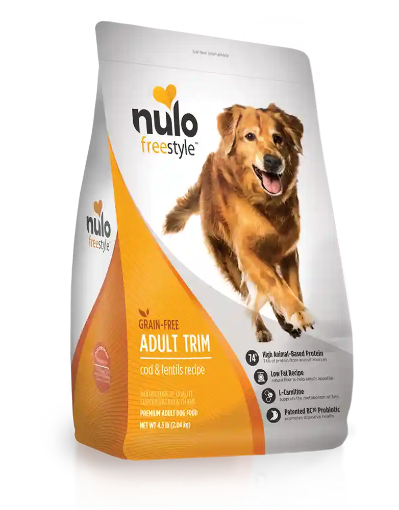 Staying fit and trim can be more challenging for some dogs. That's why we've made our Nulo FreeStyle Adult Trim formula. Our grain-free recipe of cod & lentils provides the protein and amino acids dogs need, but includes more fiber and less fat calories than our other recipes. And the addition of L-Carnitine supports the metabolism of fats. Great for all breeds and sizes that could use a little help becoming the dog they want to be.