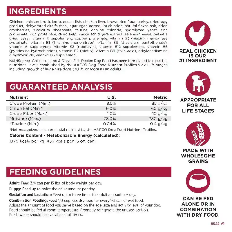 *Over 40 years of experience in manufacturing dry and moist dog food, cat food and treats. NutriSource Chicken, Lamb and Ocean Fish canned dog formula is formulated to meet the nutrition levels established by the AAFCO Dog Food Nutrient Profiles for all life stages. Feed one can a day for every 20 lbs. of. body weight. Adjust Feeding Levels to your dog"s individual needs. Puppies and nursing dogs may require two to three times the amount normally fed. Fresh water should be available at all times.