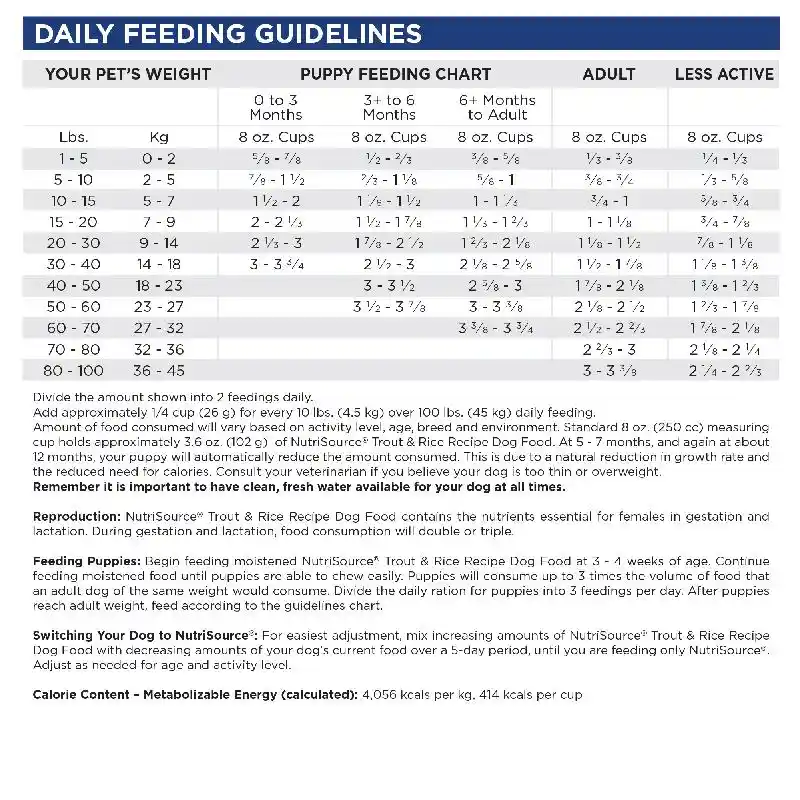 As a member of our grain inclusive series of dog foods, NutriSource® Trout & Rice Recipe is formulated to meet AAFCO guidelines for all life stages including growth of large size dogs (70 lbs. or more as an adult).