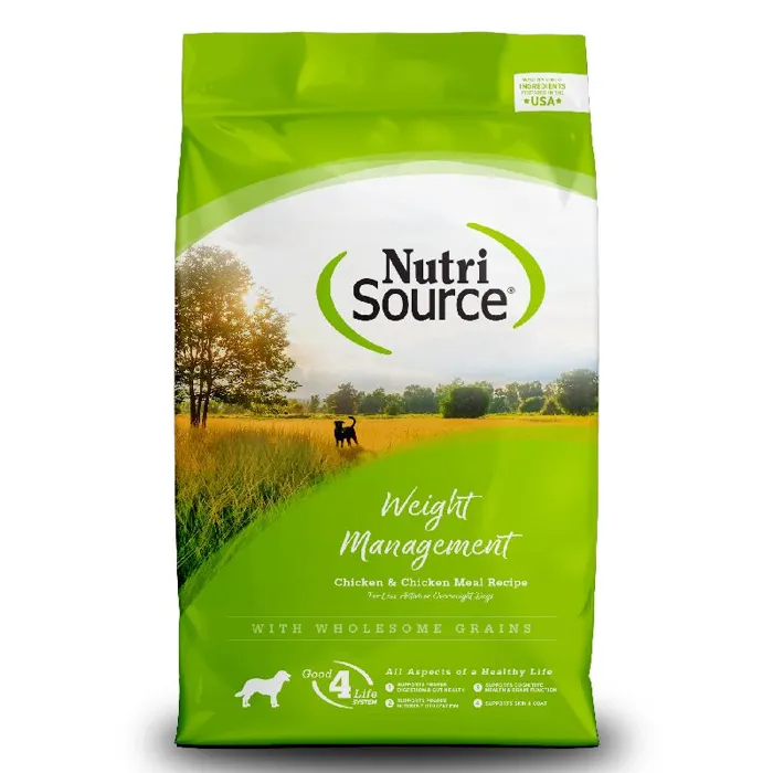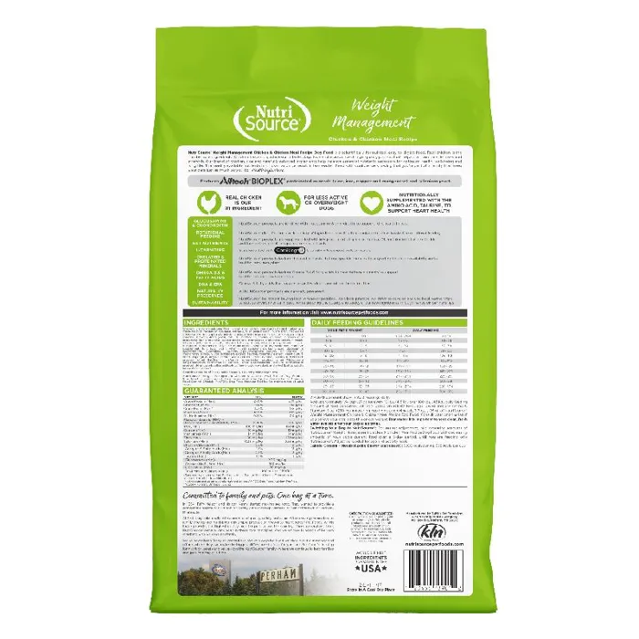 Made for heavier and less active pups, NutriSource Weight Management Chicken and Chicken Meal Dry Dog Food offers a low fat and easy to digest recipe. High quality ingredients like humane certified chicken are used in addition to the added chondroitin and glucosamine to help joints and mobility. NutriSource Weight Management Chicken and Chicken Meal Dry Dog Food also has higher amounts of fiber to help your pup feeling full, longer! Nutrisource recipes always include their Good 4 Life system with ingredients that work together to promote gut health often showing health improvements within the first feeding!