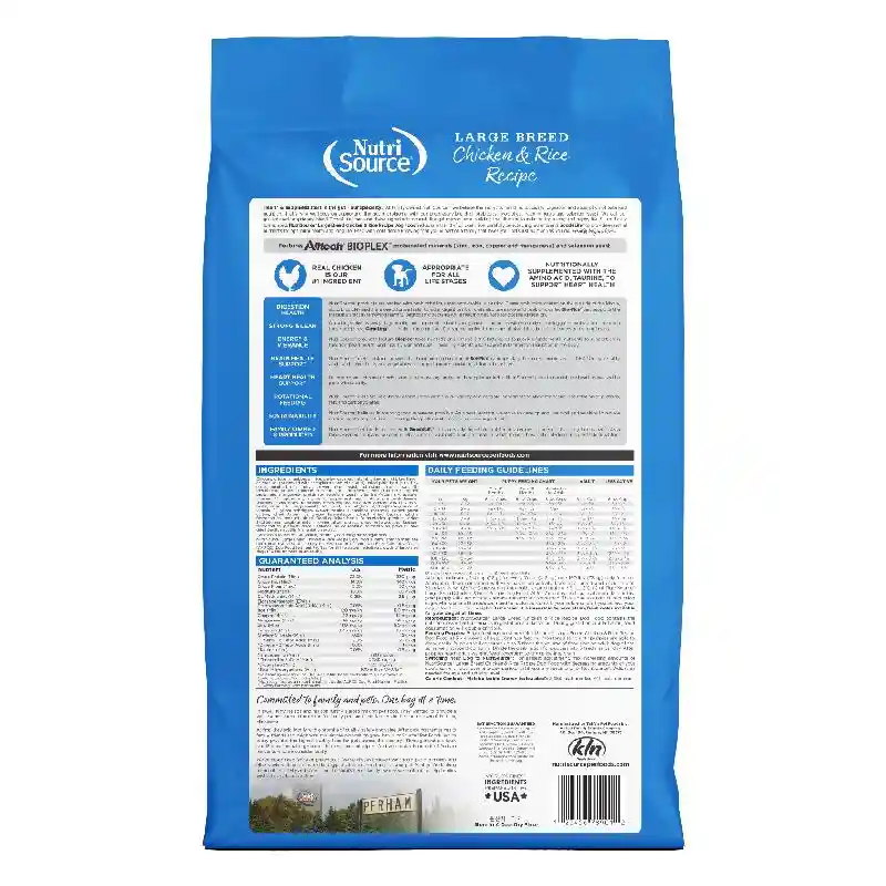 With the needs of pups expected to be larger than 50 pounds full grown in mind, NutriSource Adult Large Breed Chicken and Rice Dry Dog Food utilizes a holistic, easy to digest recipe for ideal health maintenance in large breeds. Using humanely certified chicken along with other holistic ingredients, this recipe provides perfectly balanced nutrition your pup is sure to love! Nutrisource recipes always include their Good 4 Life system with ingredients that work together to promote gut health often showing health improvements within the first feeding!