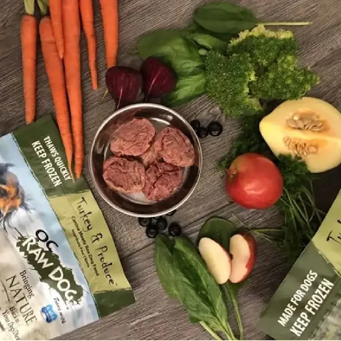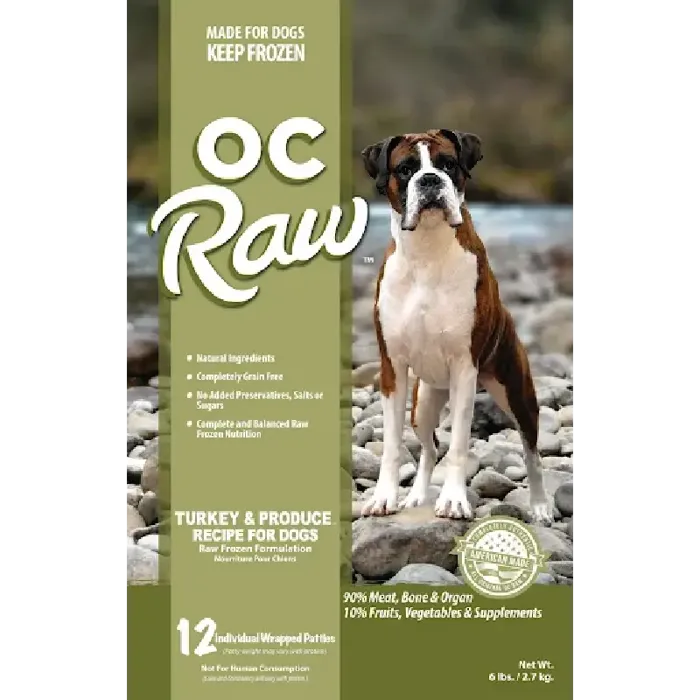 OC Raw's Turkey & Produce Dog Food is pure, wholesome nutrition your pet craves and needs for optimal health. Limited, real ingredients including naturally lean California raised, antiobiotic and hormone free turkey, carrots, apples, spinach, acorn squash, cod liver oil, blueberries & spirulina are combined in a complete and balanced recipe. OC Raw uses only premium ingredients - all natural, whole muscle and organ meat, and farm fresh produce, everything grown in the USA. USDA certified meats. Naturally processed without heat or pressure. No preservatives, chemicals, fillers, or grains. Made in the USA. Delicious nutrition your dog will love! Net wt. *Please note this product is available for in store pickup only.